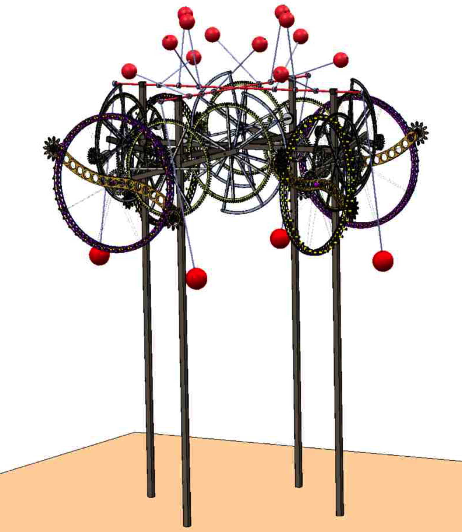 Eine Abwandlung der 2014 für die Basler Uhrenmesse geschaffenen Vier-Quadranten-Maschine beinhaltet auf luftigen fünf Metern Höhe vier gleichartige Time Machines, die mit ihrem Orbitalantrieb und der voll-mechanischen Kraftübertragung ein faszinierendes und vielschichtiges, wenn auch nahezu geräuschloses Bewegungskonzert liefern. Die vier Seiten takten voneinander unabhängig und vollführen mit ihren verlängerten Pendelgewichten ein rhythmisches Konzert beeindruckender Komplexität.