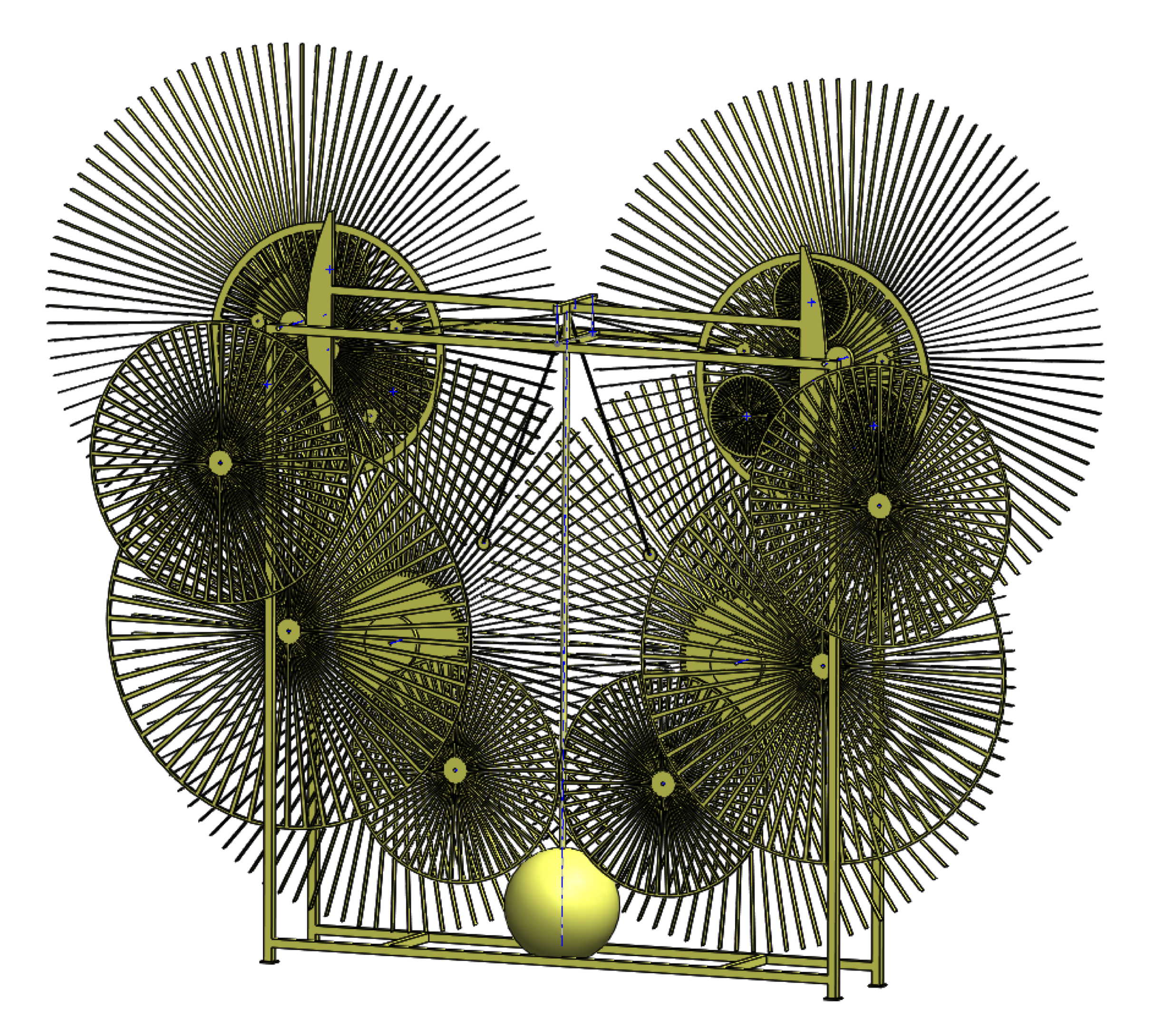 Eine Pendelmaschine, deren schweres Pendel die Zeit in ein visuelles Feuerwerk verwandelt, durch die irritierende Transparenz und Interferenz ihrer Myriaden von filigranen, fächerartigen Speichen hervorgerufenen Lichteffekte den Betrachter in ihren Bann zieht.