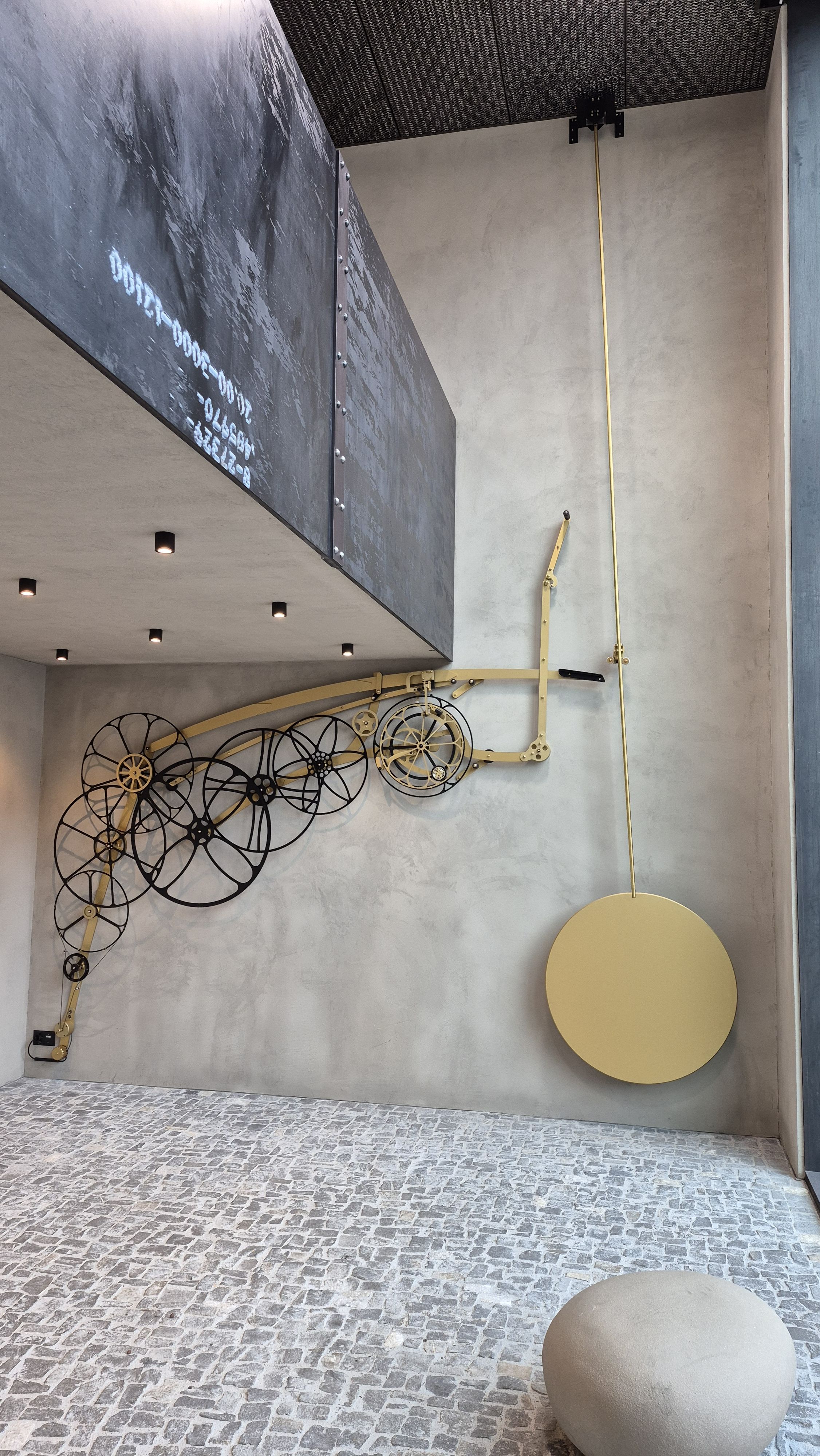 At the renowned metal construction company MERKLE, we are commissioning a large pendulum machine designed specifically for the company's entrance area: the pendulum, which is almost six meters long, swings majestically slowly with a swing duration of over four seconds, creating a unique atmosphere of calm.