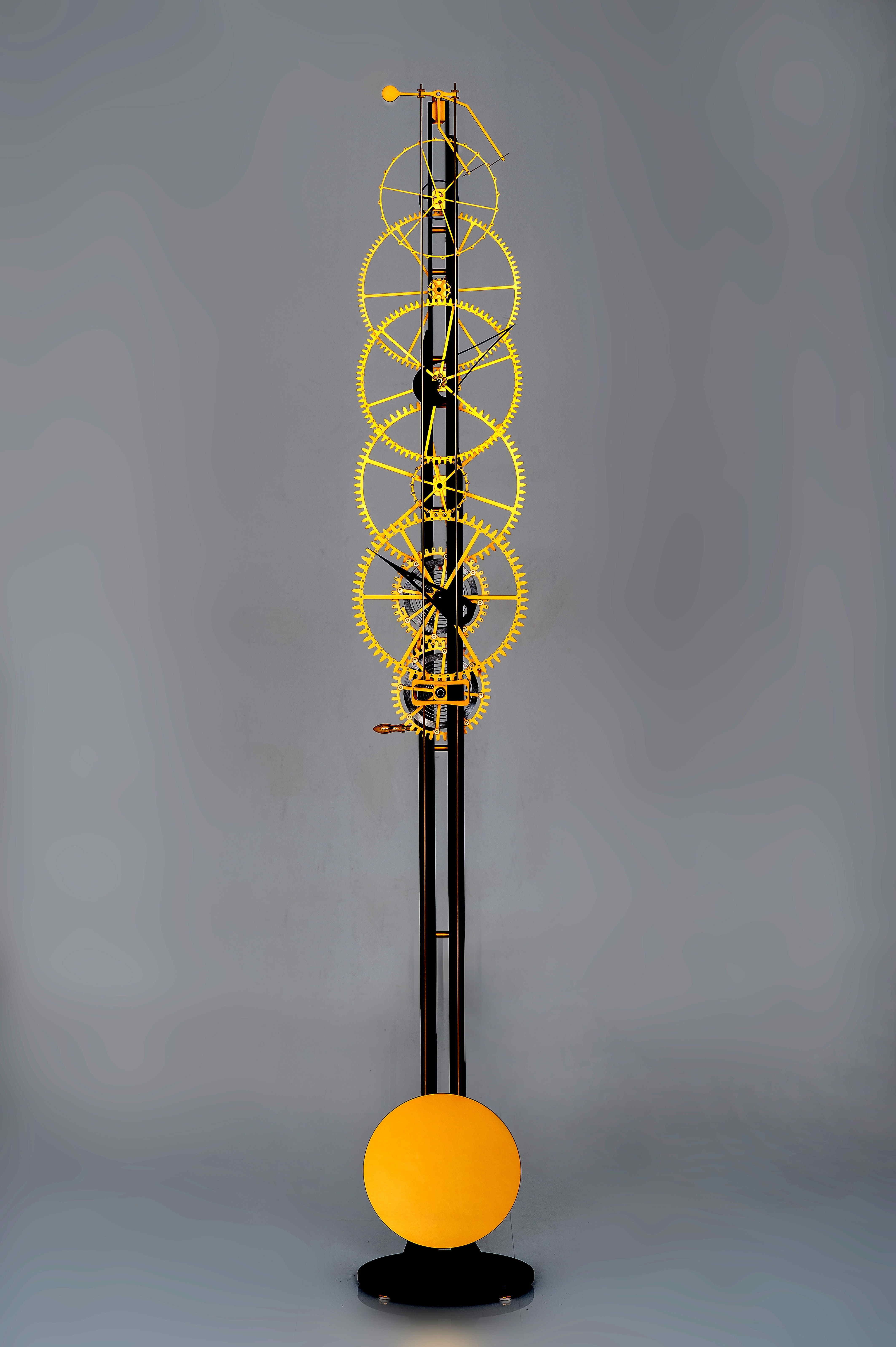 The very special feature is the pendulum. Inspired by a monumental installation that I was able to create 11 years ago, and which still exerts a great fascination with its 12 meter long pendulum (one pendulum swing lasts six seconds!), I have also breathed a pendulum into this clock, which swings leisurely at a similar, almost meditative frequency!
